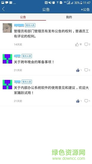 公告系统:支持富文本编辑和附件上传,阅读状态实时追踪,重要公告强制阅读,评论区支持@功能,可将公告快速转发至相关群组。