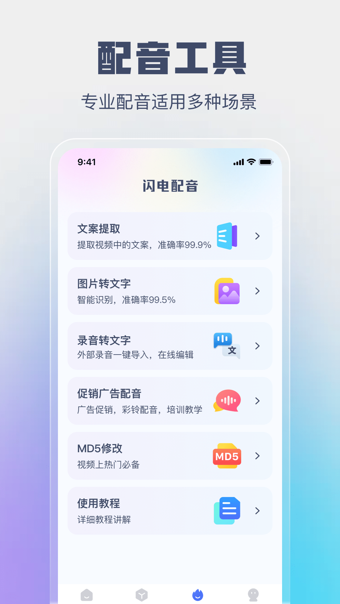 闪电app是一款功能强大且实用性极高的智能语音合成软件,致力于为用户提供专业、高效的配音解决方案。无论是个人用户还是企业客户,都能通过这款软件轻松实现高质量的语音合成需求。软件集成了先进的AI语音技术,支持多种配音模式,包括智能语音合成、真人录音、广告模板等,满足不同场景下的配音需求。