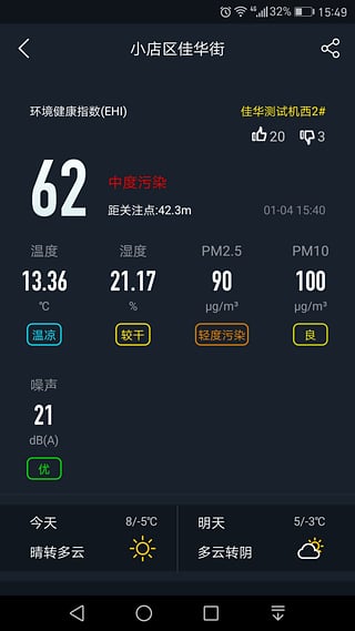 -周边环境地图:基于LBS定位技术,智能匹配最近的监测站点数据,以可视化方式展示周边3公里范围内的空气质量热力图。