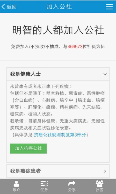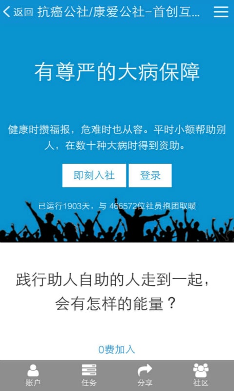 完全免费加入,无需预缴费用,只有在其他成员患病时才需要分摊互助金