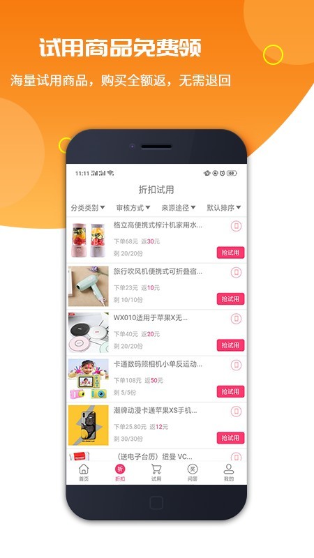 选拍要试用的产品;系统会根据用户画像智能匹配适合的试用商品,提高申请成功率,让每位用户都能找到心仪的产品。