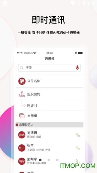 【即时通讯】企业/团队组织架构一目了然,一键查找直接对话,沟通更高效,保障内部通信和信息交流快捷通畅。支持群组讨论和文件共享,让协作更简单。