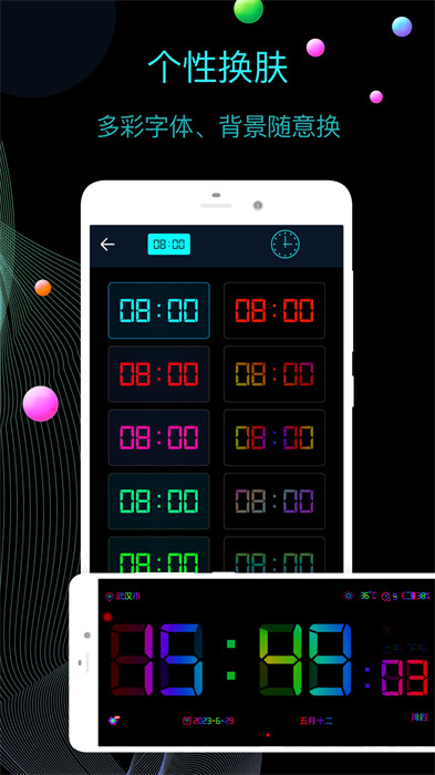 【全屏时钟】提供横竖屏两种显示模式,内置数十款精美皮肤供用户选择,同时还支持自定义皮肤功能,让用户能够打造专属的个性化时钟界面。