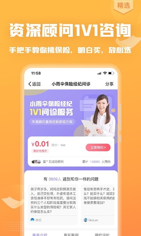 【专属顾问】平台提供1V1专属保险顾问服务,专业顾问会根据您的家庭情况、财务状况等个性化因素,为您量身定制最适合的保障方案,真正做到省时省心又省力。