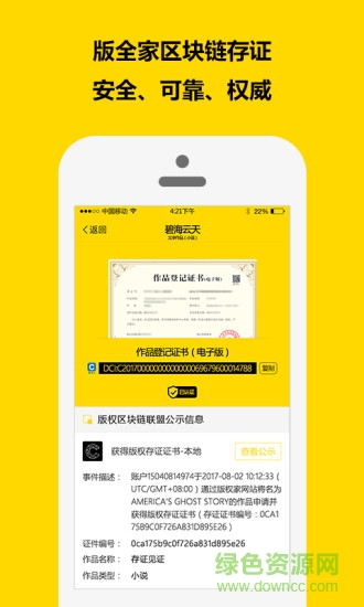 申请成功,可以获得中国版权保护中心审核批准的数字作品版权登记证书(电子版),全国通用,可在线查询和验证。证书具有法律效力,为您的原创作品提供强有力的法律保障。