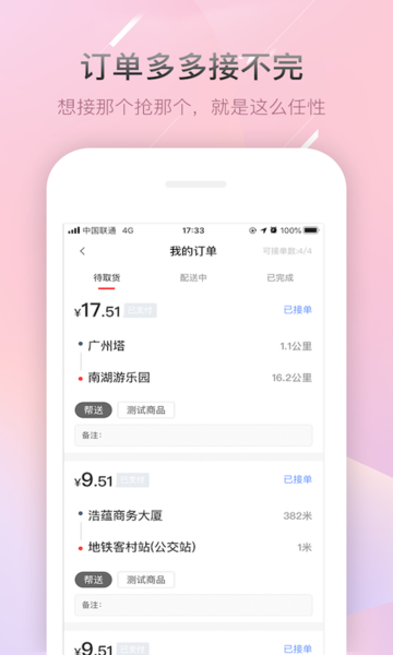 帮啦帮手端app拥有多项创新功能,为骑手提供极致的接单体验。首先,软件采用实时定位抢单系统,骑手可以随时随地一键抢单,不错过任何赚钱机会。其次,骑手可以自由安排时间,充分利用自己的空闲时间进行跑腿任务,实现工作与生活的完美平衡。此外,订单详情一目了然,配送路线清晰明确,让骑手省时省力完成配送。最重要的是,平台订单量充足,骑手可以随心所欲地选择自己想接的订单,真正做到"想接哪个抢哪个"。