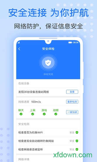 安全体检,实时检测wifi网络环境,365天保证用户上网安全;定期更新安全数据库,防范最新网络威胁。