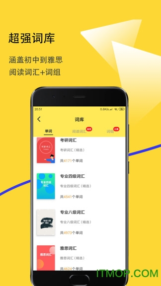超强词库:涵盖初中到雅思,阅读词汇+词组。词库内容持续更新,包含考试高频词汇和实用表达。用户可以按考试类型筛选词汇,针对性备考。