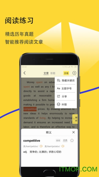 阅读练习:精选历年真题,智能推荐阅读文章。系统会根据用户的词汇量推荐合适难度的文章,循序渐进提升阅读能力。每篇文章都标注了生词,方便查阅。