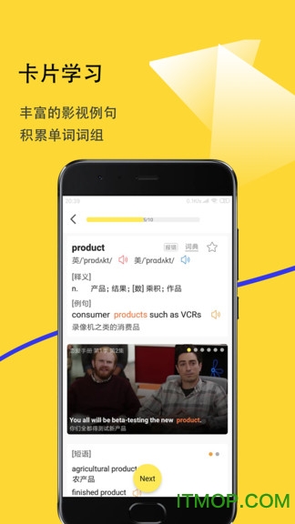 卡片学习:丰富的影视例句,积累单词词组。每个单词都配有多个真实语境例句,帮助理解单词用法。还可以收藏喜欢的例句,建立个性化学习资料库。