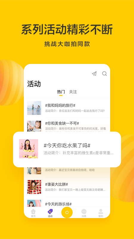 我们定期与国内外知名母婴机构合作,推出形式多样的线上亲子活动。从才艺展示到亲子游戏,从手工制作到科普实验,让家长和孩子足不出户就能享受高质量的亲子时光。参与活动还有机会赢取精美礼品,赶快带着宝贝一起加入吧!