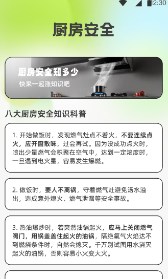 厨房安全知识学习:软件特别设置了厨房安全专区,提供从刀具使用到火候控制等全方位的安全指导。这些实用的知识不仅能帮助用户避免烹饪过程中的安全隐患,还能提升整体的烹饪体验。