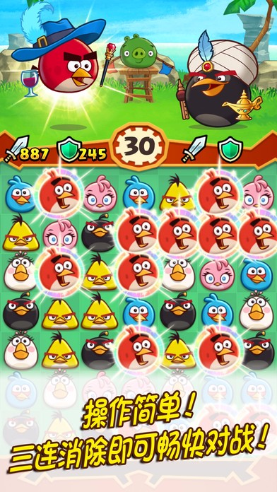 游戏玩法简单有趣,采用经典的三消规则,无论是横向还是纵向排列,只要凑齐三个以上相同的愤怒小鸟图案就能完成消除。在限时挑战中,你需要快速消除更多小鸟来攻击对手,消除数量越多,造成的伤害就越大。当能量条积满时,还能释放威力强大的特殊技能,给敌人造成致命一击。此外,游戏还加入了多种道具和增益效果,让战斗策略更加丰富多变。