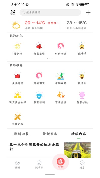 城市论坛始终关注用户体验的每一个细节,为您带来以下亮点功能:您可以第一时间掌握最新发布的帖子和回复内容,及时参与热门话题讨论;内置的天气预报功能让您随时了解天气变化,为日常生活提供便利;强大的搜索功能让您快速找到感兴趣的内容和用户;热点新闻板块让您足不出户就能知晓天下大事;覆盖全国各省市的本地资讯服务,让您随时掌握家乡动态。