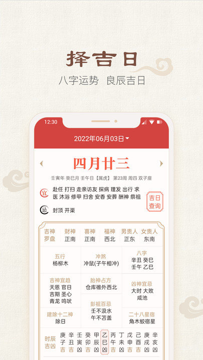 ·黄历功能:提供专业的黄历查询服务,帮助用户挑选良辰吉日,避开不利时辰,无论是婚嫁、搬家、开业等重要事项,都能为您提供专业的择日建议,让您的生活更加顺遂如意。