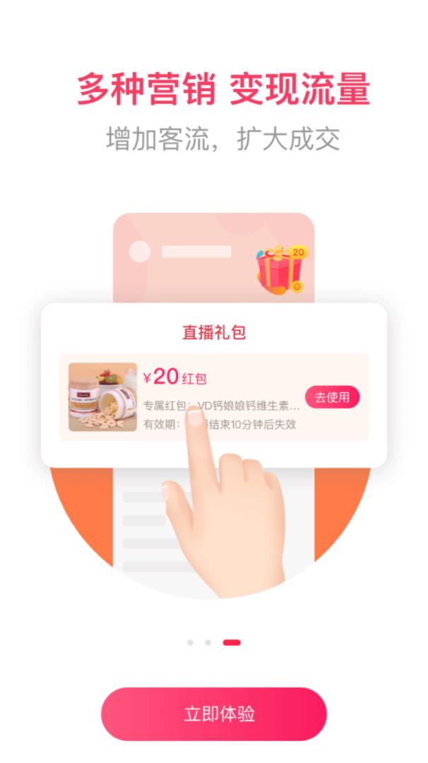 直播电商,边播边卖,自主内容,想播就播,完全掌控直播节奏;产品讲解,实时互动,真实体验,品质可见,让顾客买得放心;多种营销工具组合使用,变现流量,增加客源,扩大成交,提升复购率;私域流量撬动公域平台,获得更多流量支持,实现品牌曝光与销售双增长。此外,智能数据分析功能可帮助商家优化直播策略,精准触达目标人群。