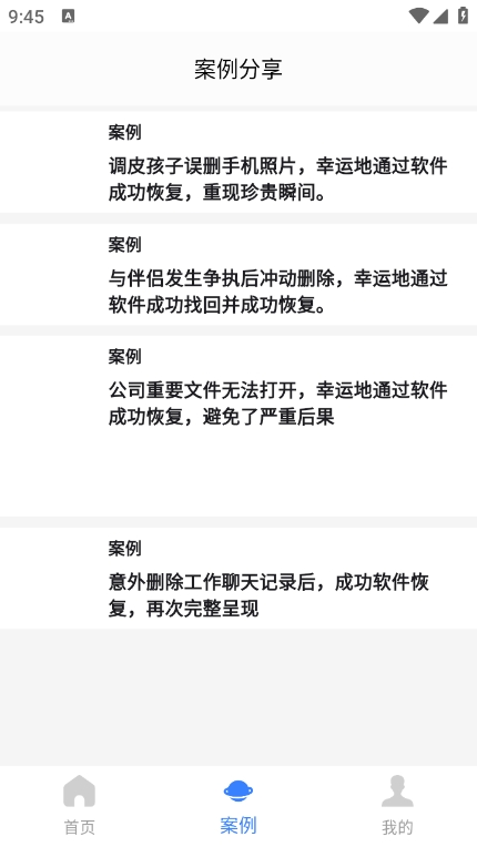 应用内设有特色案例分享专区,通过真实案例向用户展示软件的各项功能和使用技巧,帮助用户更好地掌握恢复方法。在个人中心界面,用户可以查看隐私政策、提交使用反馈、联系客服支持,以及进行账号登录和会员开通等操作。