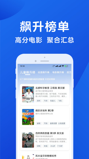 排行榜功能:软件提供了多种专业榜单,包括儿童飙升榜、动漫飙升榜、欧美动漫榜、电影飙升榜等,帮助用户快速发现当下最受欢迎的影视作品。