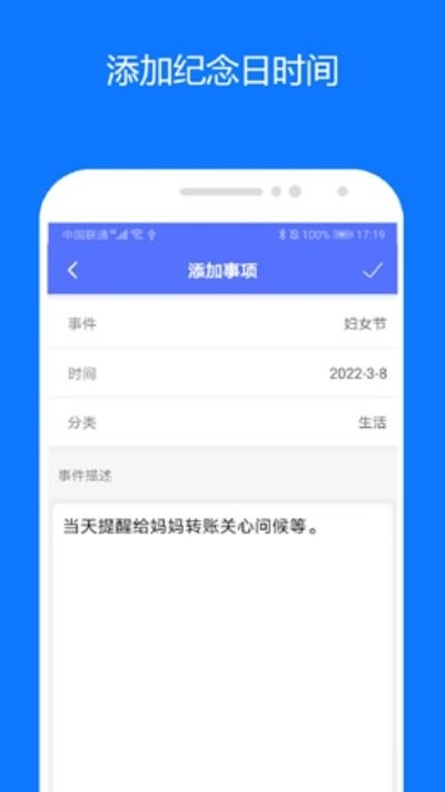 支持默认分类,纪念日、工作、生活、学习任由你选择,还可自定义添加新分类,满足多样化需求。