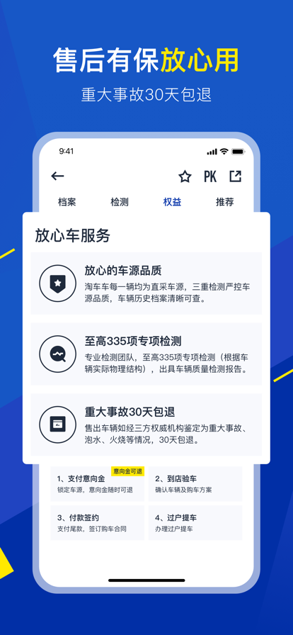 「直营门店有保障」淘车车在全国范围内建立了200多家直营门店,为用户提供线下看车、试驾等全方位服务;「车况更放心」所有车辆均经过统一采购流程和专业化的检测体系,最高可达335项质量检测,严把品质关;「售后有保障」平台承诺重大事故30天内包退,让用户购车无忧;「无忧质保」提供1年或3万公里免费质保服务,用户还可付费升级17大系统更全面的质保方案;「在线订车」支持线上订车服务,不满意可随时退订,让购车更省心;「预约试驾」提供便捷的试驾预约服务,让用户能够实地体验车辆性能;「快速卖车」为卖家提供高效便捷的卖车服务,免费检测评估,估价精准,最快可实现当日成交。