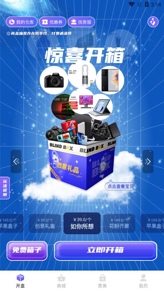*我们在购物的同时还可以开盲盒,盲盒有多种礼品供我们选择。平台设有每日专属盲盒区,包含限量款商品和隐藏大奖,用户可通过积分兑换或直接购买参与。