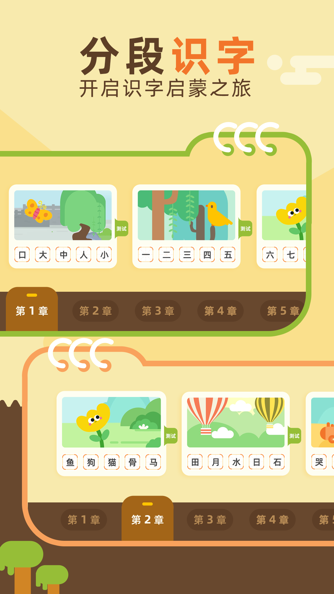 -测:每个学习单元都配有综合测试环节,将5个汉字混合测试,通过游戏化的评估方式,让家长更清楚地了解孩子对汉字的掌握情况;
