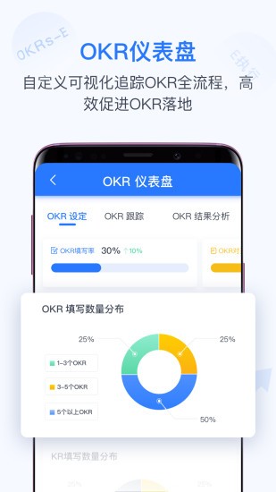 OKR仪表盘,帮助管理者快速了解企业OKR落地最新状况,提供多维度的数据可视化分析;