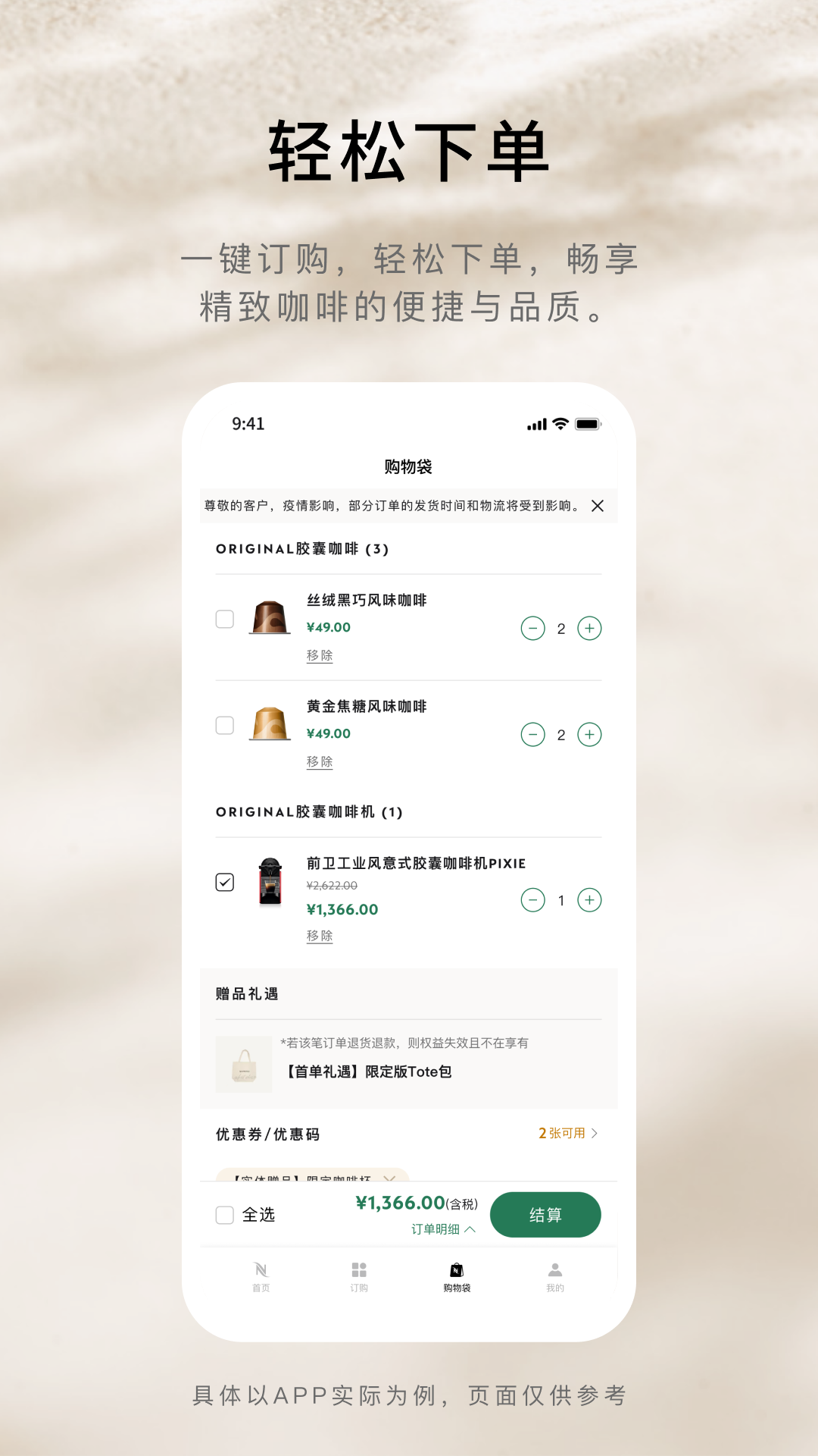 通过手机商城查看各类胶囊咖啡、胶囊机器以及配件,随时随地轻松下单:优化后的移动端购物体验支持多种支付方式,订单状态实时更新,配送进度一目了然,让咖啡补给从未如此简单。