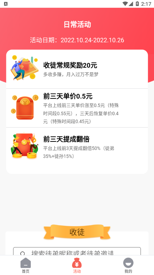 优看宝提供极具竞争力的收益方案:基础转发单价0.5元(特殊时间段0.55元),三天后恢复单价0.4元。收徒奖励丰厚,常规奖励20元/人,上线前三天提成翻倍50%(徒弟35%+徒孙15%)。平台还定期举办各类福利活动,如节假日红包雨、阅读排行榜奖励等,让用户获得额外收益。提现便捷快速,满10元即可申请,工作日24小时内到账,周末提现最晚下周一到账,全程透明无隐藏费用。