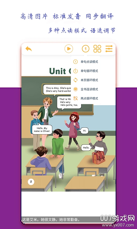 软件采用中英文双语对照设计,语音同步准确清晰。所有内容录音质量上乘,发音地道纯正,原汁原味。语音播放功能灵活便捷,支持即点即学,让孩子可以随时随地跟读模仿。最重要的是,软件完全同步现行教材制作,内容保持一致,是课堂学习的完美补充。