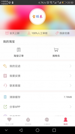内嵌模块,一键免费领取优惠券并跳转至手机淘宝对应商品下单。需先登陆手机淘宝账号,下单时自动使用内部优惠券。所有已购买订单在淘宝、支付宝APP中均可查询订单详情。系统还会自动记录用户领取的优惠券,在即将过期时发送提醒,避免优惠券浪费。