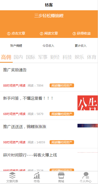 首先需要下载并安装转客app,注册过程简单快捷,无需实名认证,新用户注册即可获得6888时间资产的丰厚奖励。登录后,用户可以在首页浏览各类精选文章,每阅读完一篇文章都能获得几十个时间资产的奖励。系统设置了每日阅读上限,大约阅读10篇文章后就会提示达到当日上限。