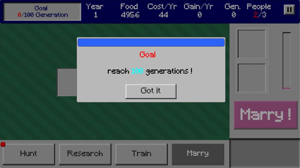 在《百年家族》中,玩家需要全面管理家族的生存与发展。游戏界面设计直观明了:顶部左侧显示当前游戏目标,右侧则实时更新家族状态,包括年份、食物储备、年度消耗与获取量、人口代数和总数等关键信息。玩家必须时刻关注食物储备情况,因为一旦食物耗尽,家族成员将面临饥饿威胁,甚至可能导致家族灭亡。