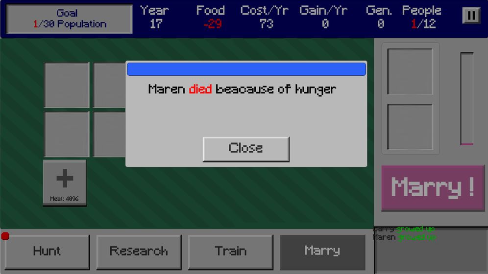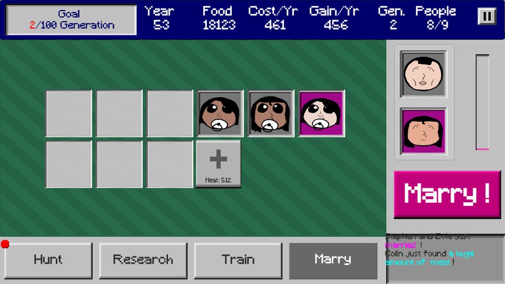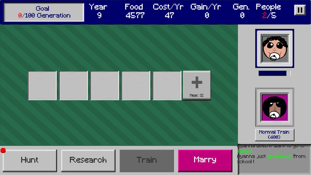 《百年家族.EXE》是一款深度模拟经营游戏,它将策略规划与生存挑战完美结合。游戏的核心机制在于如何高效利用有限的资源来维持家族的延续与发展。每局游戏开始时,系统会随机生成不同的挑战目标,比如让家族存活到特定年份、积累指定数量的食物储备,或者达到一定的人口规模。为了达成这些目标,玩家需要精心规划家族成员的职业分工,合理安排打猎、研究、训练和婚配等活动。游戏采用独特的世代更替系统,随着时间推移,老一代家族成员会逐渐离世,新一代成员将继承家族事业,这种动态变化为游戏增添了更多策略深度和情感共鸣。