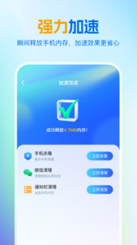 加速手机运行:该软件还具有加速手机运行的功能。它能够清理手机内存,释放更多的运行空间,提高应用程序的响应速度和运行速度。同时,它还可以优化网络连接,加快网页加载速度,让用户在使用手机时更加流畅。智能预加载技术可以预测用户可能使用的应用,提前分配资源,实现秒开体验。