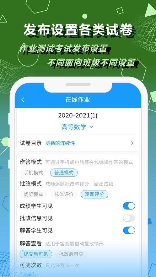 发布管理:可针对特定班级发布在线作业、随堂测试及正式考试,支持多种发布方式和时间设置。