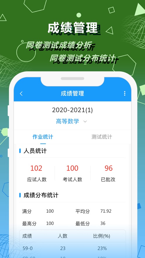 成绩管理:系统自动对批改完成的作业、测试、考试成绩进行分类归档,提供多维度的统计分析报表。