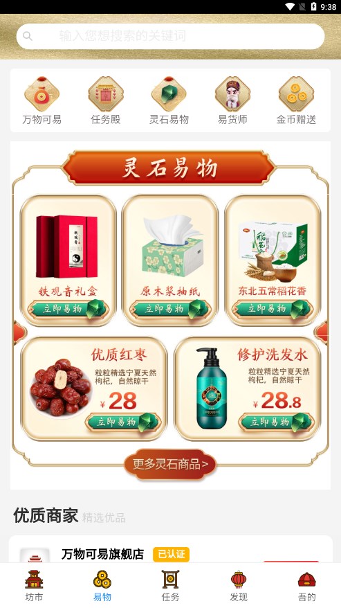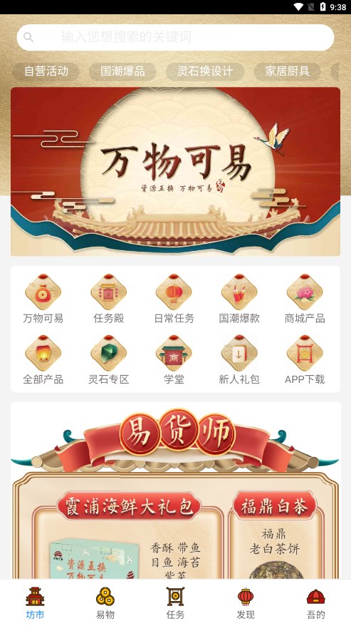 这是一款深度植根中国传统文化的创新交易平台,巧妙将"以物易物"的古老智慧与现代数字技术结合。平台不仅提供商品置换服务,更构建了完整的任务生态体系,用户可以通过完成各类趣味任务积累财富值。独特的国风视觉设计贯穿整个APP,让每一次交易都成为传统文化与现代生活的美妙邂逅。