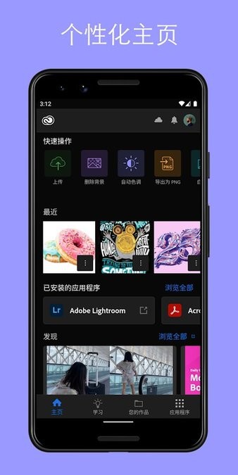 CreativeCloud持续整合Adobe最新的移动应用程序,为您提供最完整的创意工具集。这些应用专为移动端优化,能够完美配合桌面版软件使用,让您随时随地都能对作品进行专业级的调整和完善。