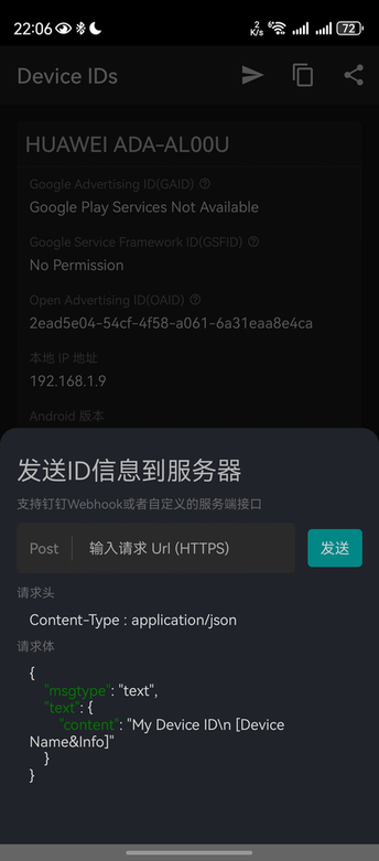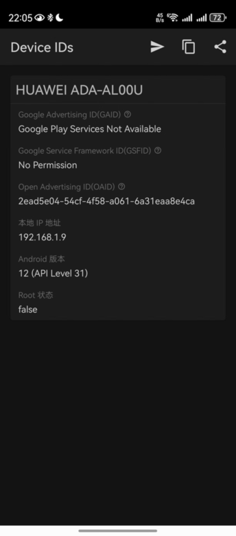 3. 点击“分享”按钮,可以将设备ID信息发送至服务器或其他应用。
