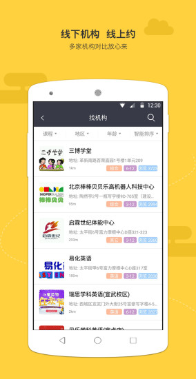 看口碑,找机构:平台收录了全国17个省、4个自治区、58个城市及4个直辖市共78000家教育培训机构信息。通过智能匹配算法,帮助家长快速找到最适合孩子的教育机构,省去奔波比较的烦恼。
