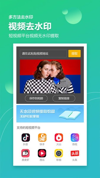 【快速去水印】:采用智能识别技术,只需简单涂抹就能快速去除大面积水印,操作简单效果出众。