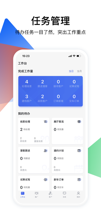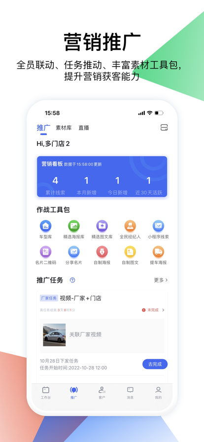 任务管理:可视化推广任务下发系统,实时监控员工任务完成进度,确保营销活动高效执行。