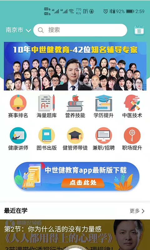 中世健教育app是一款集大健康领域培训、就业指导与推荐、健康管理工具于一体的综合性学习平台。平台汇聚了来自全国各地的优质教育资源,涵盖医师、营养师、心理咨询师、执业护士、学历提升等多个专业领域。我们拥有超过100万道精选试题,题库持续更新,确保您能获取最新、最全面的备考资料。平台采用智能学习系统,可根据您的学习进度和掌握程度,智能推荐最适合您的学习内容,让备考更高效。