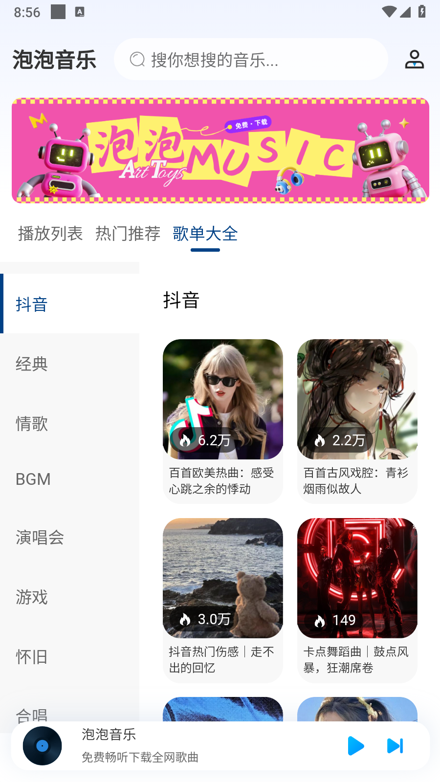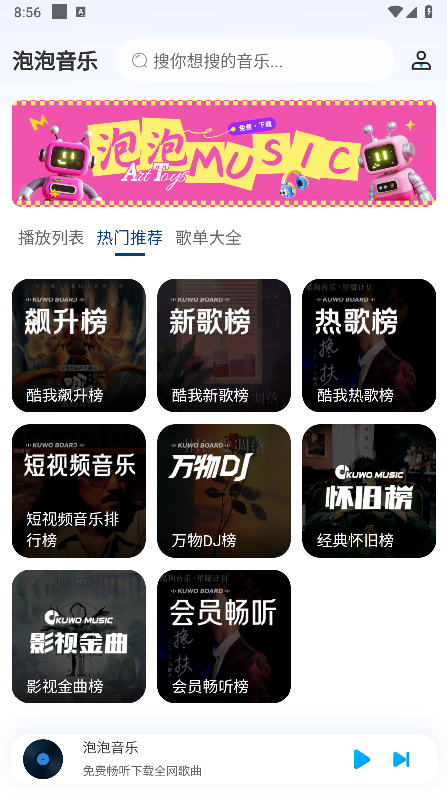 初次使用泡泡音乐App时,您会发现界面设计简洁直观。打开应用后,首页会展示精心编排的播放列表、实时更新的热门推荐以及分类明确的歌单大全。在热门推荐板块中,您可以查看包括飙升榜、热歌榜、新歌榜在内的多个权威榜单,还能发现抖音热歌、怀旧金曲等特色分类。歌单大全则按照音乐风格、使用场景等维度进行整理,包含抖音热歌、经典老歌、浪漫情歌、影视BGM、演唱会现场等丰富内容。当您找到感兴趣的歌曲时,只需轻触即可立即播放,享受高品质的音乐盛宴。