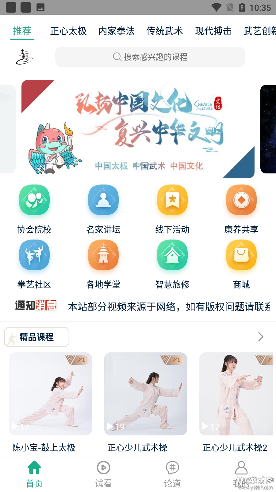 包含有精品课程、名师讲坛、拳艺社区、禅武论道、协会院校、各地学堂、线下活动、智慧旅修、商城、文化等诸多板块,这些板块可以很好的为海量武术专业者、爱好者提供个性化服务。平台还定期邀请知名武术大师进行线上直播教学,让用户足不出户即可接触顶尖武术资源。