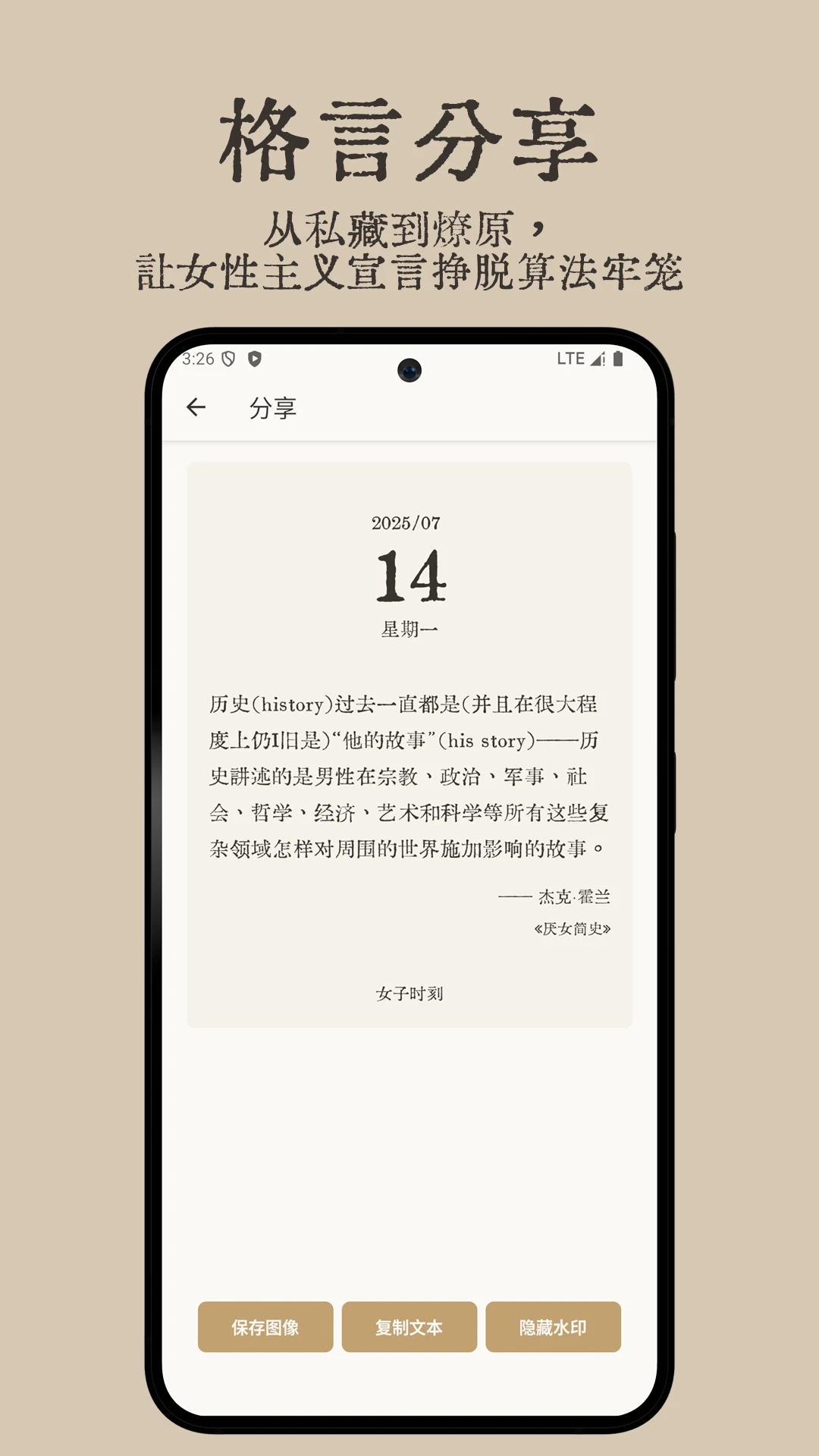 在这个信息碎片化的时代,「女子时刻」如同一座移动的智慧灯塔,为女性打造专属的精神家园。它不仅是汇聚波伏娃、金斯伯格等先驱思想的数字图书馆,更是一个集成长赋能、知识沉淀与行动传播于一体的女性主义平台。通过每日格言推送、经典文献归档和创意工具支持,平台将抽象的女性主义理念转化为可感知、可参与、可传播的日常实践,让平权意识在指尖流动中生根发芽。