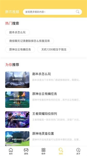 胖爪视频是一款专为游戏爱好者打造的学习平台,汇聚了海量游戏攻略、技巧视频和最新资讯。无论您是新手玩家还是资深玩家,都能在这里找到适合自己的内容。平台覆盖了市面上绝大多数热门游戏类型,从角色扮演到竞技对战,从休闲益智到策略经营,应有尽有。通过高清视频教学和详细文字攻略,帮助玩家快速掌握游戏精髓,提升操作水平。每天都会更新最新游戏动态,让您随时了解游戏圈的新鲜事。