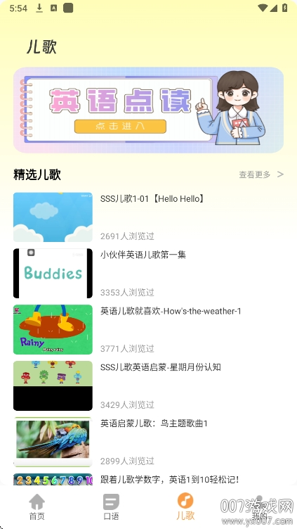 绘本与儿歌板块收录了培生经典分级读物和世界知名儿歌。所有绘本都支持点读、跟读和录音功能,并配有中文翻译和重点词汇讲解。儿歌采用动画MV形式,歌词随音乐高亮显示,帮助孩子理解歌词含义。系统会自动记录阅读进度,生成阅读报告。