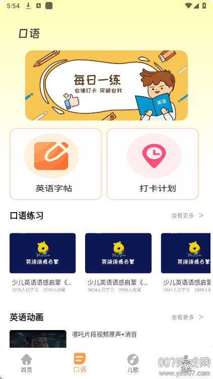 打开软件后,用户会看到一个色彩丰富、充满童趣的首页界面。首页根据孩子的年龄和学习进度智能推荐适合的学习内容。在单词学习板块,孩子可以通过互动游戏快速掌握新词汇,系统会记录学习进度并适时复习。软件内置大量原版英语绘本,支持点读和跟读功能,让孩子在阅读中提升语感。每日打卡专区帮助孩子养成规律学习习惯,还有专门的儿歌专区,收录了数十首经典英文儿歌,通过音乐和动画激发学习兴趣。